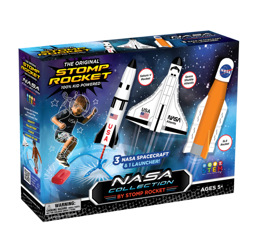 3…2…1… LIFTOFF! Introducing the all new Space Collection by Stomp Rocket! Run, Jump, Stomp and Blast off into Space for hours of active play. Ignite your cosmic curiosity and stomp to launch 3 iconic NASA spacecraft in the air. Includes 1 SLS Rocket, 1 Space Shuttle Atlantis, 1 Saturn V Rocket, and an adjustable launch stand.